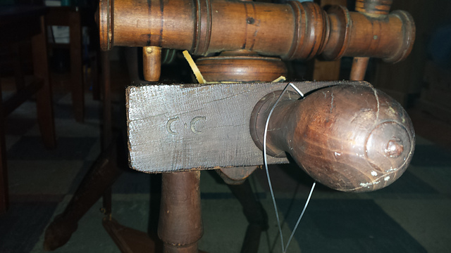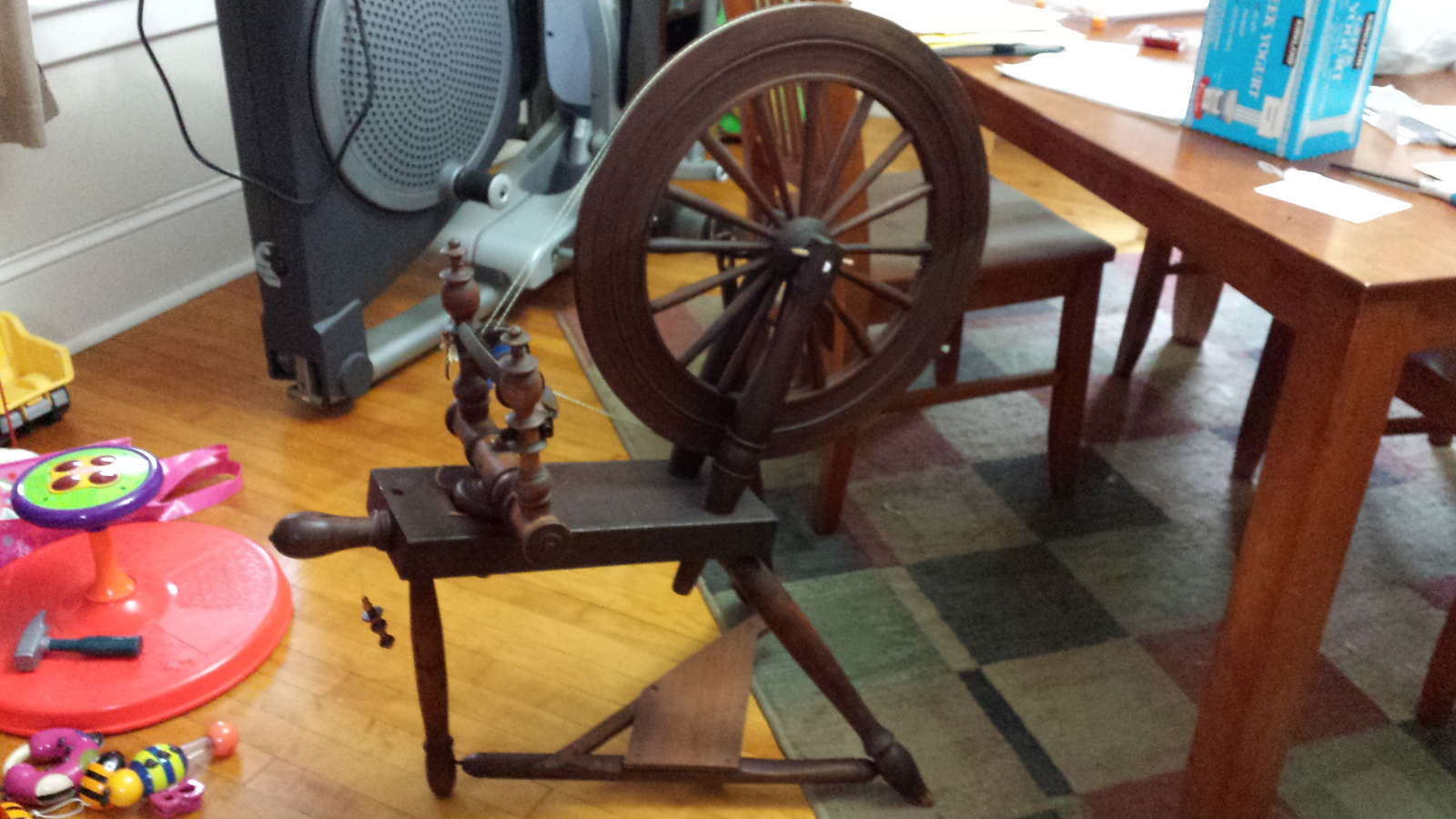 I've joined the Spindle Wheels group on Ravelry and they've been a lot of help!  We've been brainstorming possible fixes for the back end.  I'll work on that this weekend so it's good to go for Mutton & Mead.  They've also clued me in to the history of this particular wheel.  It has a maker's mark, "J Bell".  Apparently there's a James Bell from New York who made wheels approximately 1860s or so.
